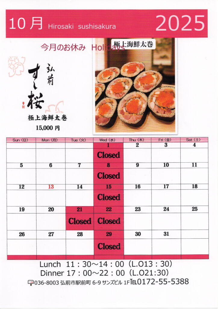 『2025年10月の営業日』 投稿日 2025年9月29日 著者 弘前 すし桜 カテゴリー 営業日 秋の行楽シーズンに入ってきました ご予約も入ってきておりますので当方HPのご予約サイトから宜しくお願い致します aomori hirosakisushisakura sushi 営業日 弘前すし桜 弘前城 弘前市 青森県