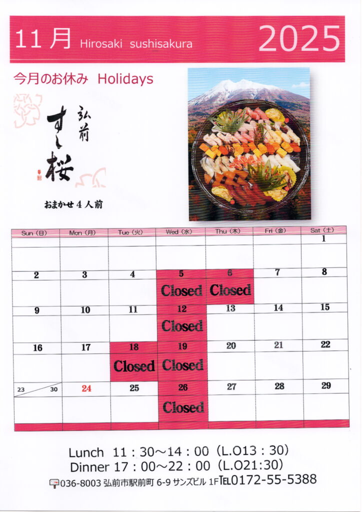 『2025年11月の営業日』 投稿日 2025年11月4日 著者 弘前 すし桜 カテゴリー 営業日 年末年始のご予約も開始いたしました ご不明な点はお電話でもお受けいたしますが、対応不可能な場合もございます。 こちらの『お問合わせ』からもどうぞご利用くださいませ