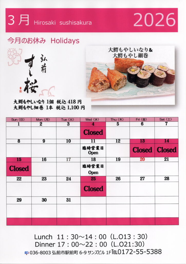 『2026年3月の営業日』 投稿日 2026年2月14日 著者 弘前 すし桜 カテゴリー 営業日 3月は13日~15日までお休みをいただきます。風間浦村の鮟鱇祭りに行ってまいります。 16日以降に美味しい風間浦の食材を振舞いますので、ぜひご来店お待ち申し上げております。 aomori hirosaki hirosakisushisakura 営業日 弘前すし桜 弘前市 青森県